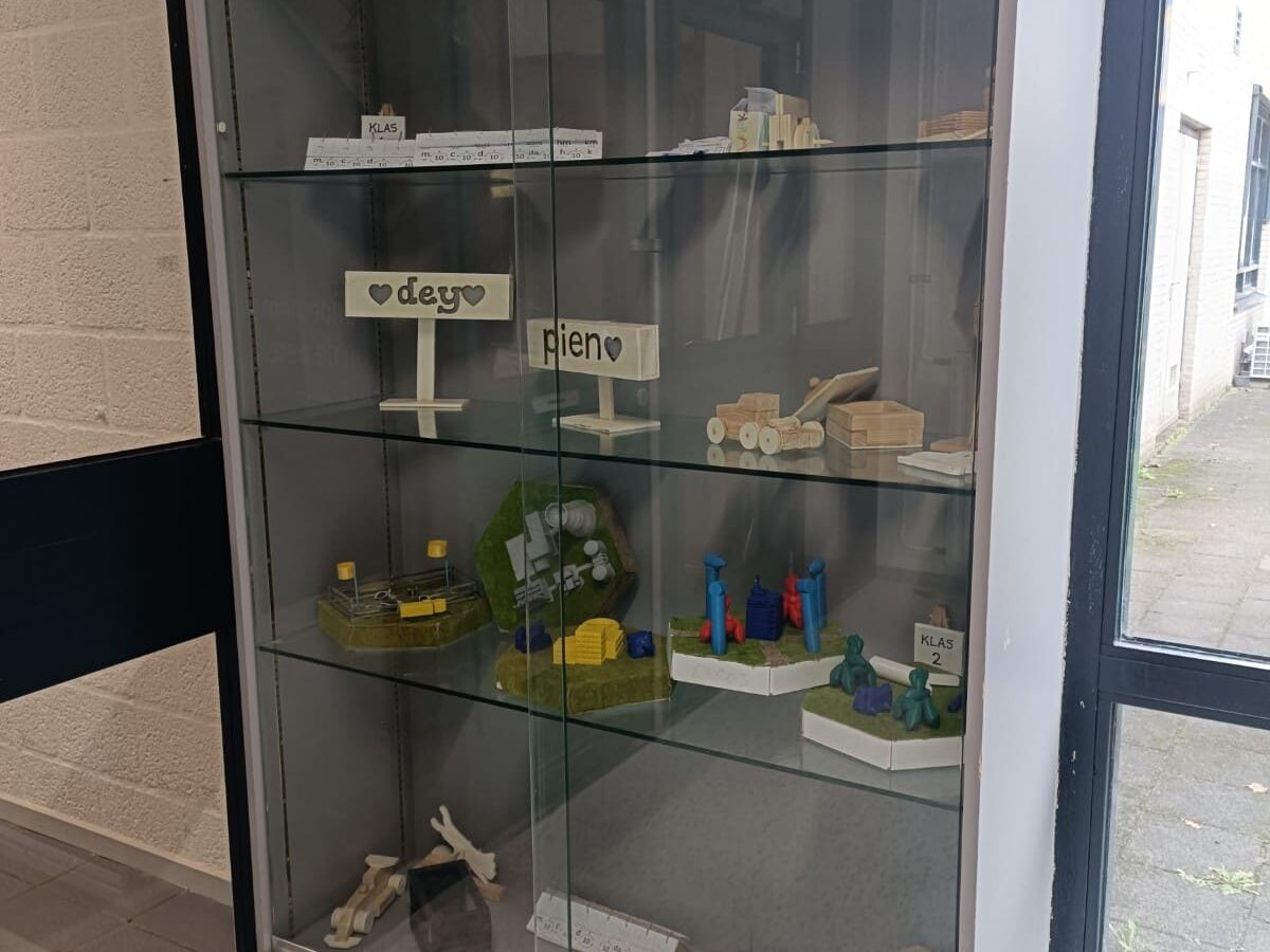 Op de gang bij het technieklokaal van het Mondriaan College staat een projectkast die in één oogopslag laat zien hoe het STEM-onderwijs zich aan het ontwikkelen is. Hier liggen de verschillende projecten van leerjaar 1 naast elkaar. Niet als losse eindproducten, maar als onderdelen van een leerlijn die volop in ontwikkeling is.