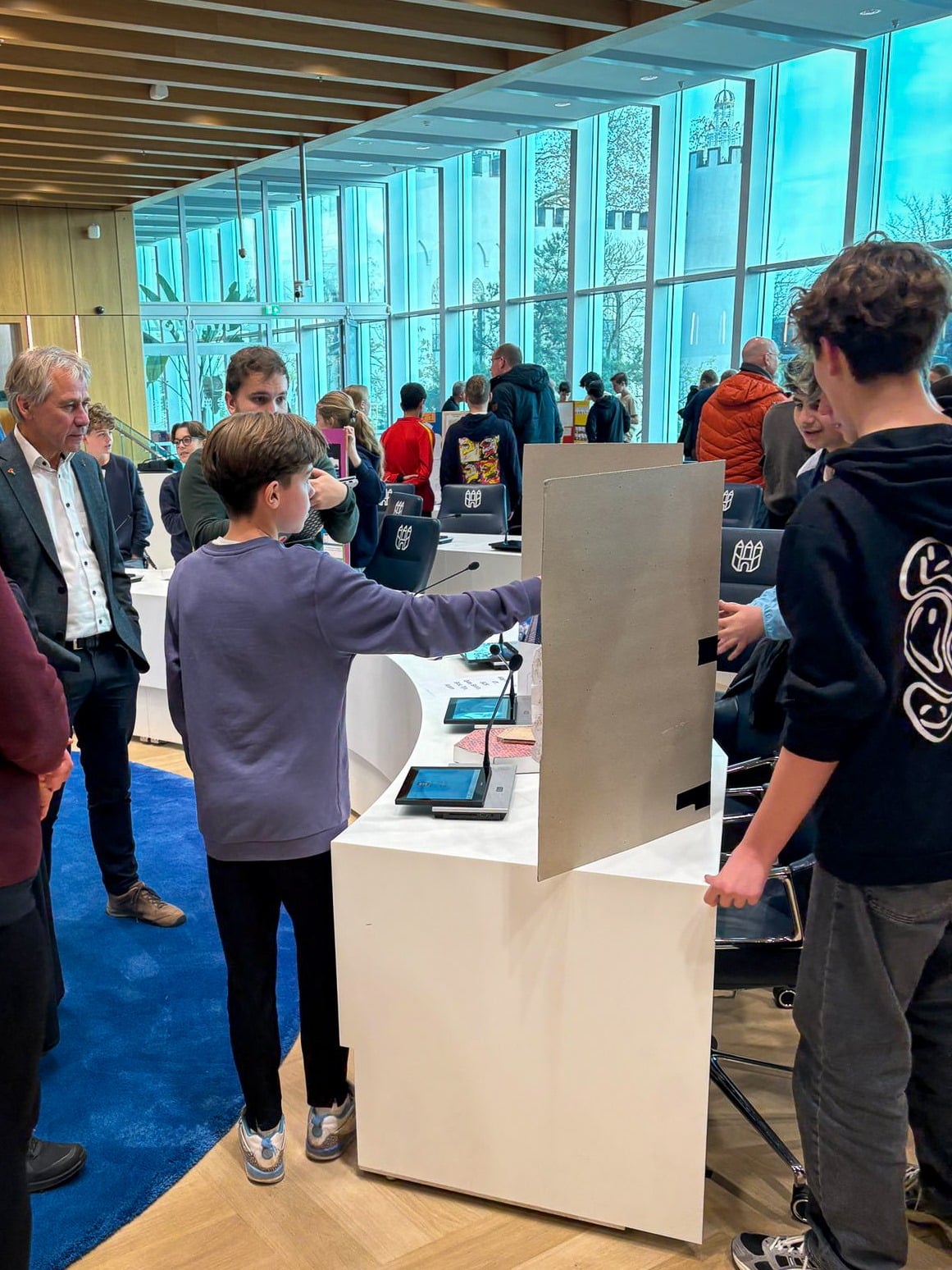 Ook Rik Grashoff, wethouder van de Gemeente Tilburg met onder meer Onderwijs in zijn portefeuille, kwam langs. Hij heette de leerlingen welkom in de Raadszaal en vertelde over de functie van deze ruimte én het belang dat jongeren nu al meedenken over hun eigen stad. Daarna bekeek hij de maquettes en ging hij in gesprek met de leerlingen over hun werk.